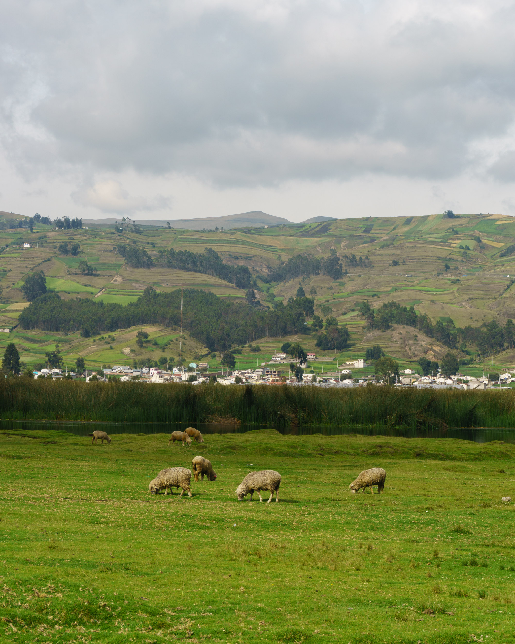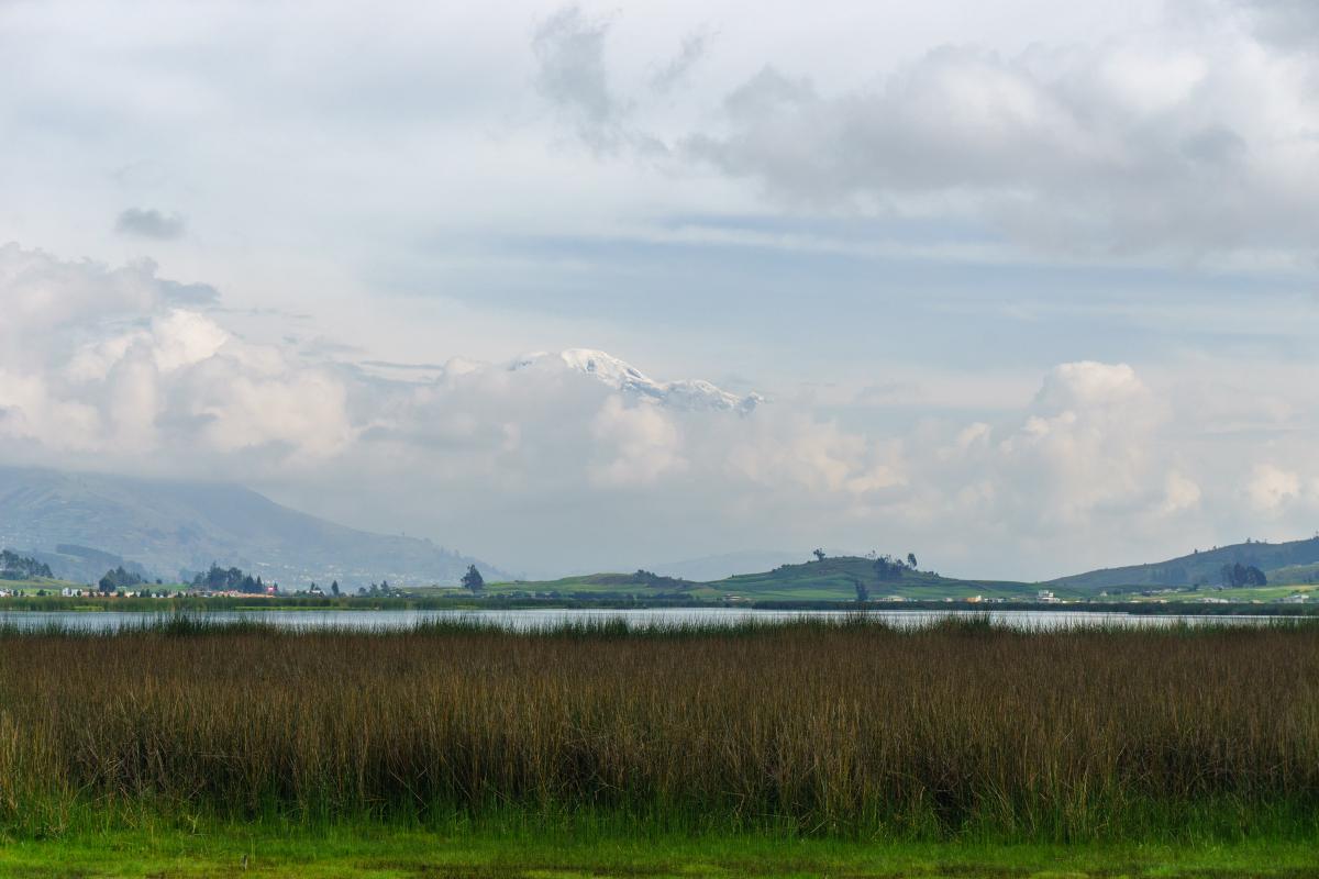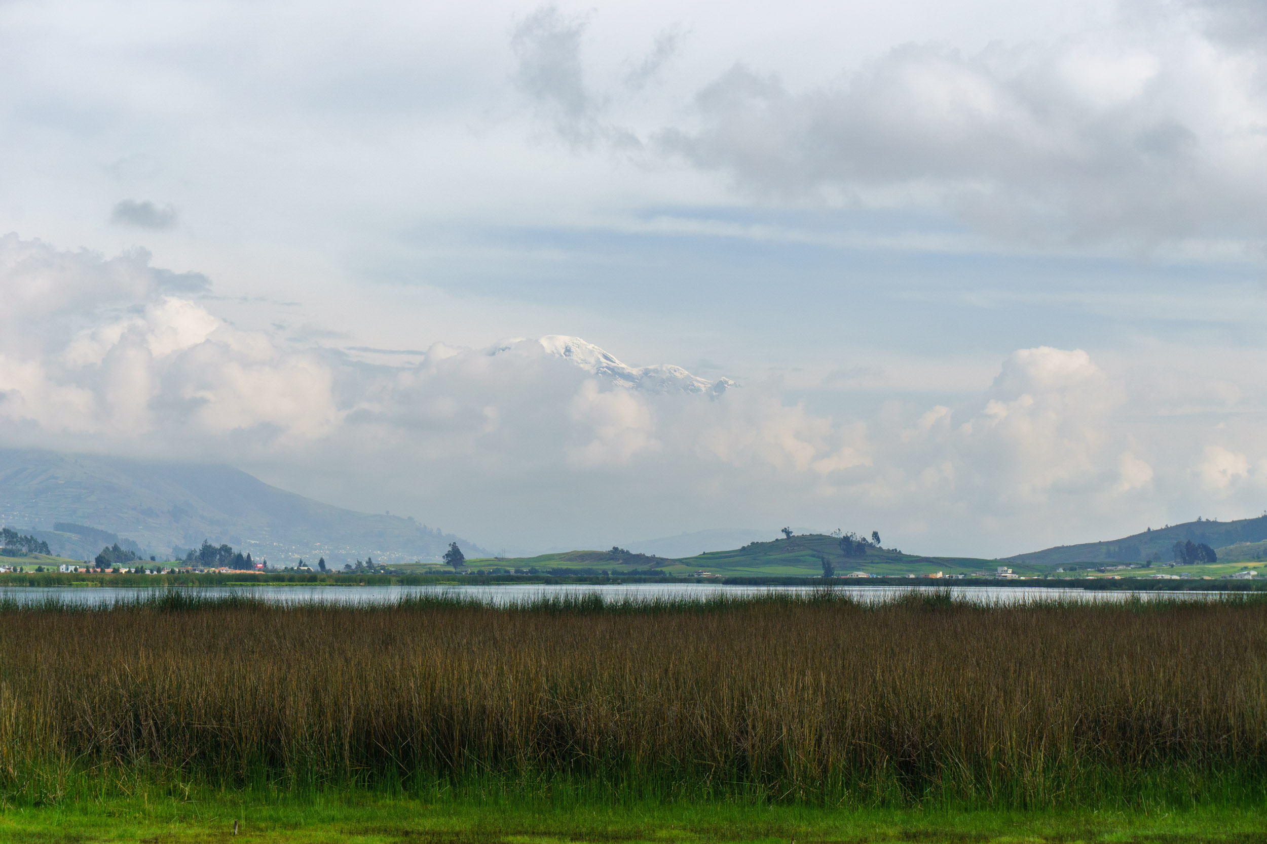 Paisajes, paisajes y más paisajes. Hoy fue un día completo de conducir y de ver paisajes. A las 8 a. m. estaba listo para salir de Riobamba. El volcán Chimborazo me acompañó durante la primera hora de viaje. Estuvo tímido al igual que ayer, escondido parcialmente detrás de las nubes. En la laguna de Colta pude tomarle una foto en la que se alcanzaba a ver su pico, aunque apenas.