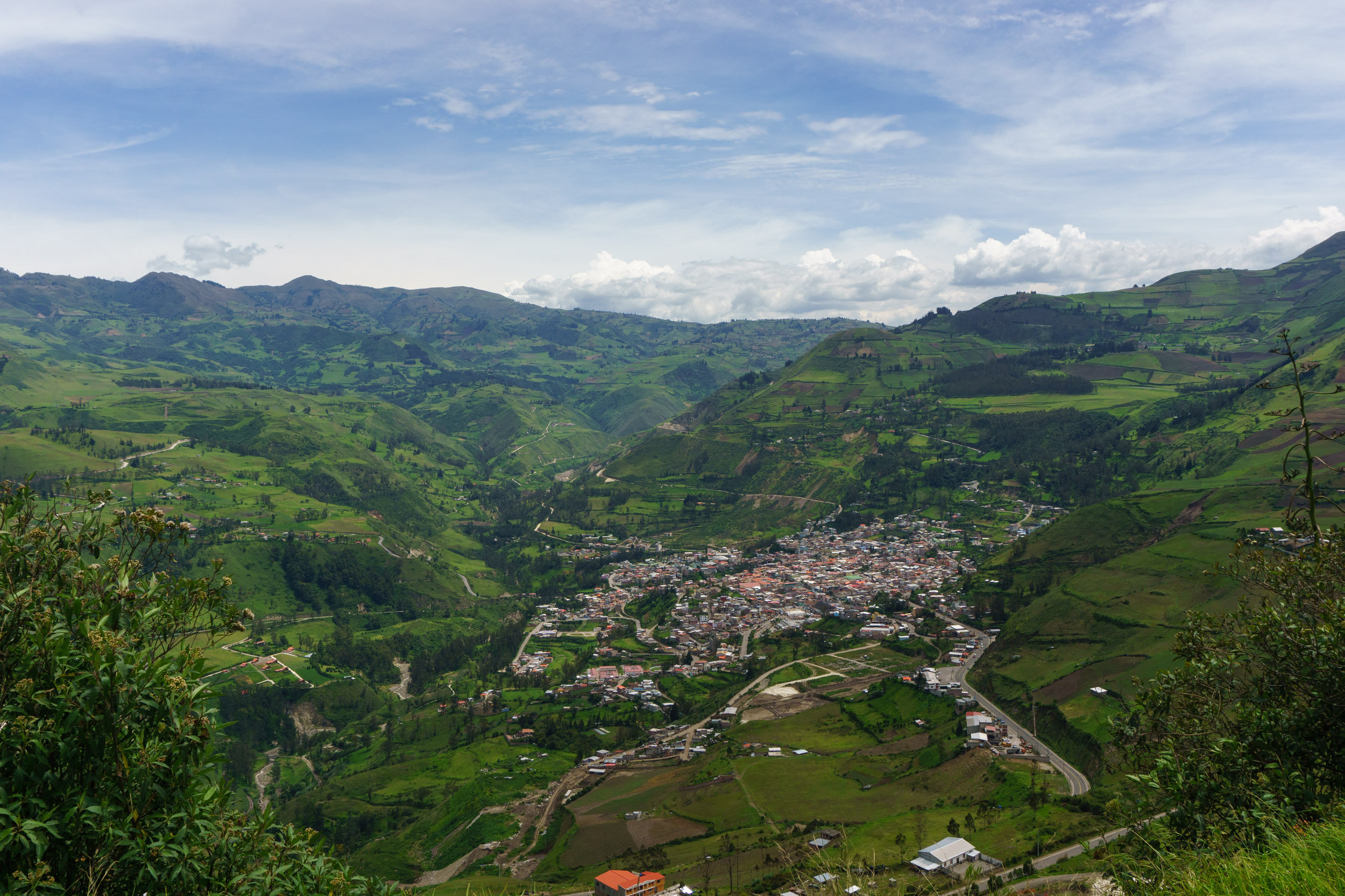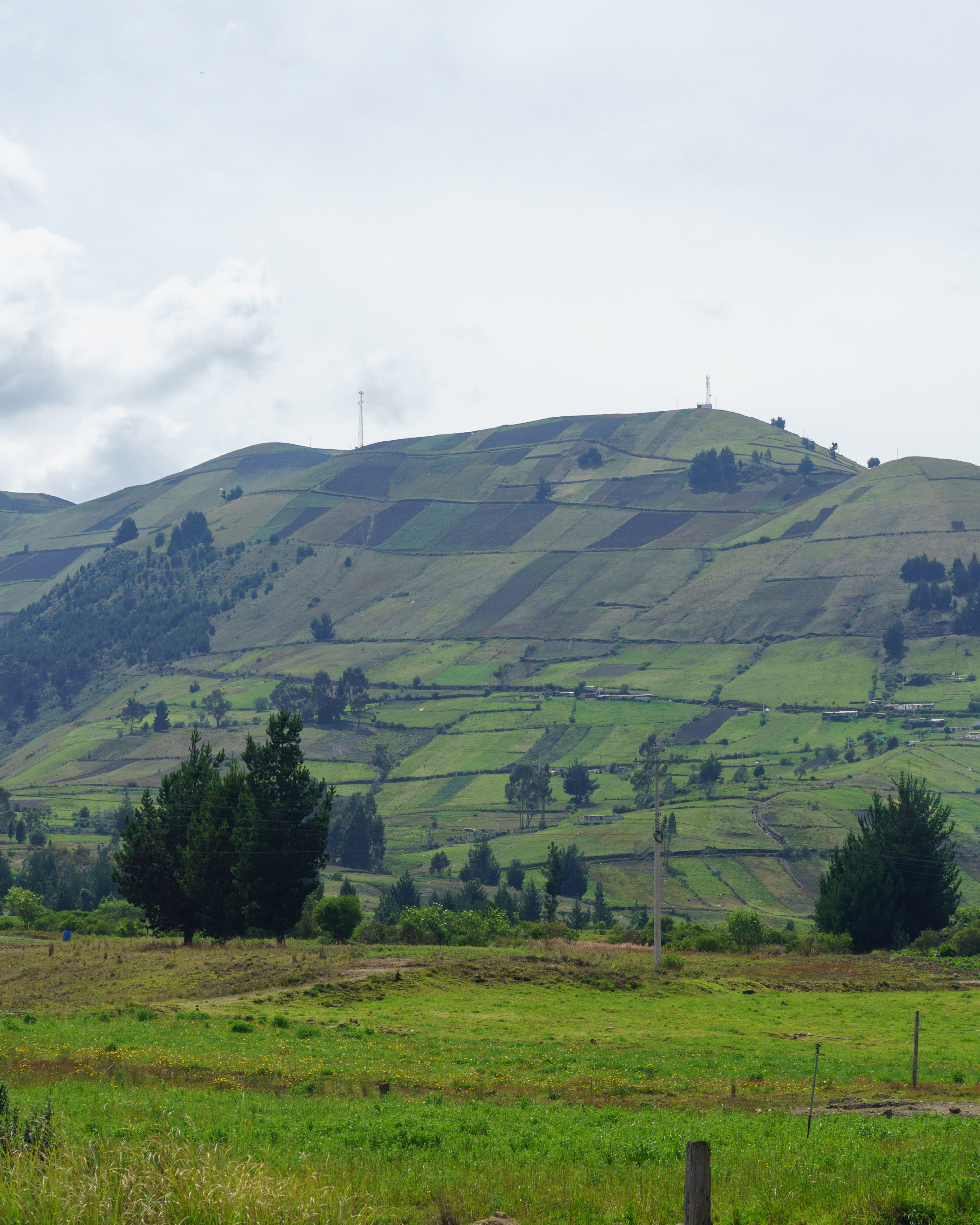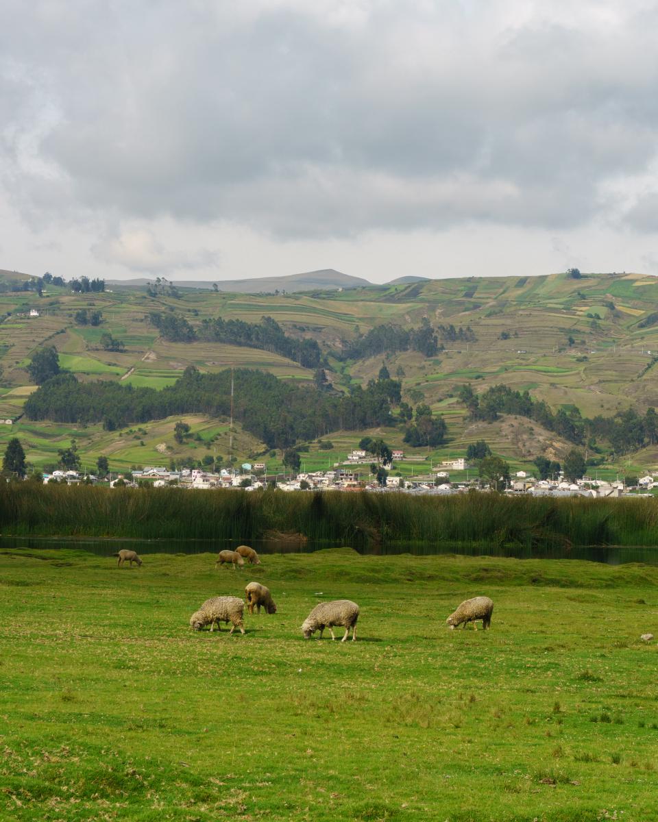Paisajes, paisajes y más paisajes. Hoy fue un día completo de conducir y de ver paisajes. A las 8 a. m. estaba listo para salir de Riobamba. El volcán Chimborazo me acompañó durante la primera hora de viaje. Estuvo tímido al igual que ayer, escondido parcialmente detrás de las nubes. En la laguna de Colta pude tomarle una foto en la que se alcanzaba a ver su pico, aunque apenas.