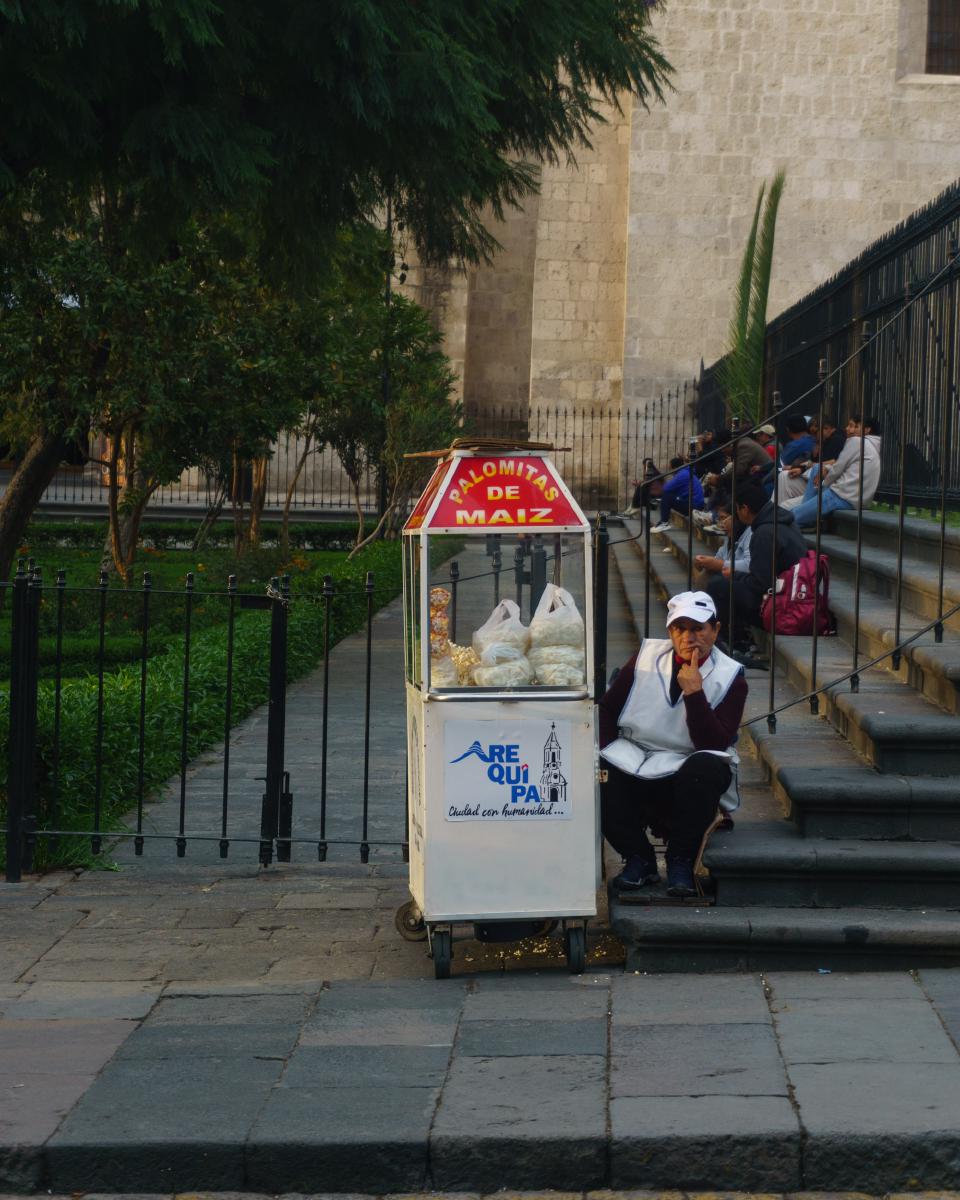La tarde se pasó caminando por el centro histórico, catalogado como Patrimonio Mundial por la UNESCO. Entre los edificios construidos en sillar (piedra volcánica blanca), hice varias paradas gastronómicas. En el mercado, probé papas rellenas, salteñas (una especie de empanada horneada), Kola Escocesa y queso helado (hecho con leche y leche condensada). Cerca de la plaza principal, comí papas fritas de huayro, una papa de piel morada originaria de Perú.
