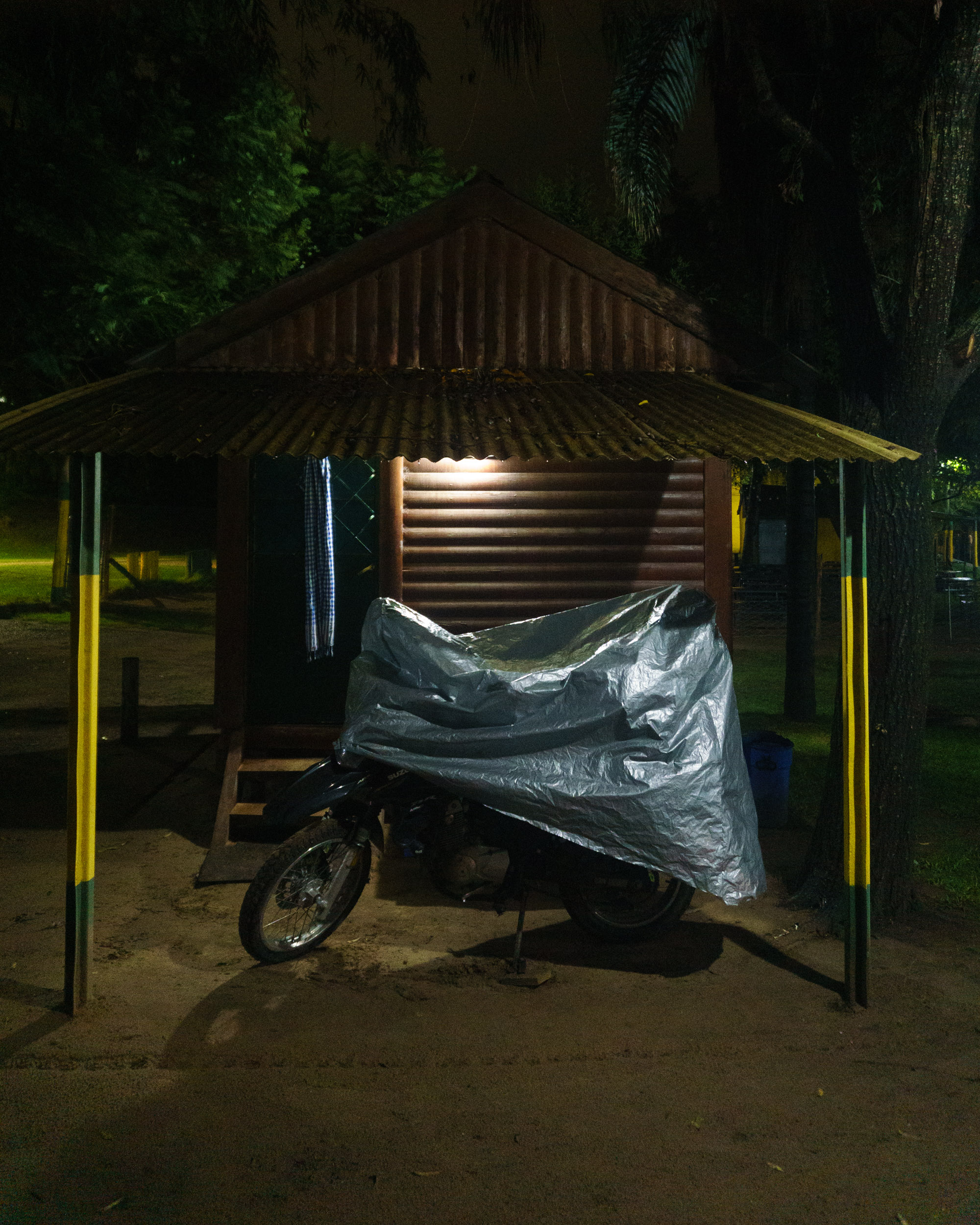 Estoy en una cabaña a orillas del río Paraná. Hoy no pude tomar ni una foto por la lluvia. Salgo de la cabaña para al menos tomar una foto de la escena actual. Tengo extendidas en todos los espacios disponibles las cosas mojadas, con pocas esperanzas de que se sequen para mañana, el último día antes de llegar a Buenos Aires.